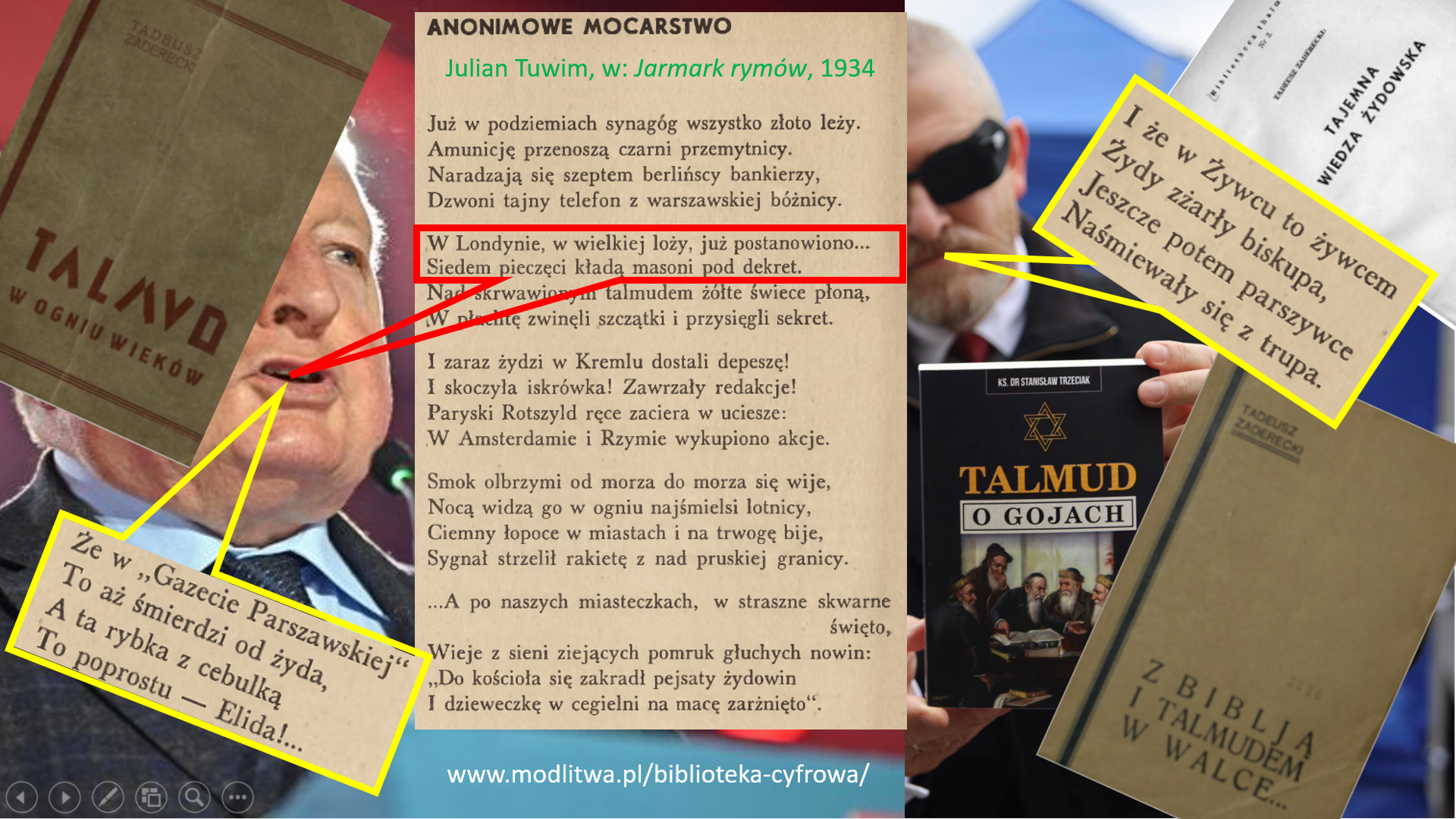 Pewna gazeta — nie będę jej reklamował wymieniając tytuł — umieściła na swej stronie artykuł Stanisława Michalkiewicza, w którym autor, omawiając działania Komisji Europejskiej w kwestii paktu migracyjnego, użył następującego cytatu: „W londyńskiej Wielkiej Loży już postanowiono: siedem pieczęci kładą masoni pod dekret. Nad skrwawionym Talmudem żółte świece płoną, w płachtę zwinęli szczątki i przysięgli sekret – pisał poeta”. I jak to bywa z cytatami wyrwanymi z kontekstu, Pan Stanisław nie poinformował swoich czytelników jaki to zacz poeta był. Spieszę więc wyjaśnić cytującemu, że Julian Tuwim (bo to on napisał te słowa w swoim wierszu zatytułowanym Anonimowe mocarstwo) zadrwił z ludzi tego pokroju, co autor wspomnianego artykułu. Wiersz powstał w 1934 roku, gdy w Polsce (i szerzej w Europie) nasilała się fala antysemickich i spiskowych teorii, które przypisywały Żydom, finansistom i „światowym lożom” masońskim władzę nad światem. Takie narracje rozpowszechniali publicyści narodowi, w tym w szczególności ks. Stanisław Trzeciak, a w Niemczech propaganda hitlerowska. Tuwim w tym utworze przejmuje styl, rytm i słownictwo propagandy spiskowej, aby pokazać jej absurd. Robi to z celowym przerysowaniem i teatralnością, jakby cytował ulotkę antymasońską, doprowadzając ją do groteski. W efekcie powstaje pastisz języka paranoi. Niestety, pisał do inteligentnych ludzi. A dzisiaj jego satyra jest często opacznie odbierana.